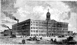 By 1866, the company employed about 230 workmen and manufactured about a thousand pianos a year,[18]—up to 30 a week—including uprights, squares, and grands. The factory was equipped with a 30 horsepower (22 kW) steam engine, as well as steam-powered elevators and drying rooms, and had been augmented with a second 40-foot (12 m) wide building where grand cases, sounding boards, and actions were manufactured and cases varnished and iron frames gilded.[19] Further additions and a cupola completed the factory, which in 1869 fronted 210 feet (64 m) on Eutaw Street and 165 feet (50 m) on West Street.[20] Their sales ranked third in the United States, after Steinway & Sons of New York and Chickering & Sons of Boston,[21] and by 1870 their output was estimated to be about forty pianos a week, priced between $600 and $2,000.[22]