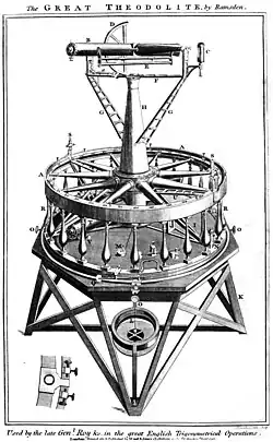 The main survey instrument from 1802 for the primary triangles was a Great Theodolite made by William Cary. This was very similar to the instruments used in France and Britain for previous trigonometrical surveys. It had a horizontal circle that was 36 inches (91 cm) and the readings were taken using a microscope. The vertical graduated circle was 18 inches (46 cm) in diameter.[10] It weighed about half a ton and needed twelve men to carry it. Lambton measured all three angles of triangles in several cases to establish the spherical excess (angles of triangles on a sphere sum up greater than 180°). When the survey was carried out from Madras to Bangalore, Lambton was able to compare the Bangalore baseline of 1804 with the calculated measurements and the difference was about 3.5 inches (8.9 cm).[15]