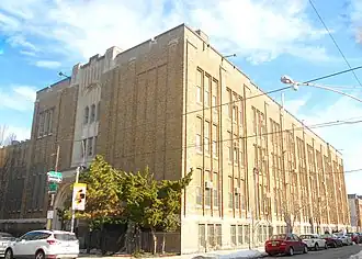 The historic school building was designed by Irwin T. Catharine and built in 1930–1931. It is a 16 bay, yellow, white, and brown brick building on a limestone base in the Art Deco-style. It features pronounced molded brick mullions, two Gothic arched entrances, and brick piers.