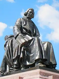 Rice's body was eventually cremated, and the urn of his ashes was kept in the vault of the business office of the Trustees of the Institute until it was deposited beneath the monument erected in his memory on the campus of the Institute.[4] In 1930, John Angel completed the Founder's Memorial at Rice University — depicting a seated William Marsh Rice — in line with specifications by architect Ralph Adams Cram.[15]