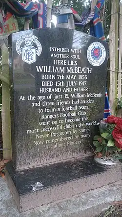 Willam McBeath's contribution to the creation of Rangers Football Club was not considered to be as celebrated or honoured as much as the other founding members of the club. His grave remained unmarked at the back end of a Lincolnshire cemetery until a Rangers fan placed a solitary Saltire and a simple plaque bearing the inscription: "In this place lies William McBeath who in 1872, Along with three friends, had an idea to start a football Team. That team became Rangers F.C."