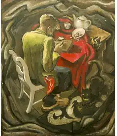World War II interrupted Goodell's burgeoning art and exhibition career. On enlistment in the U.S. Naval Reserve in July 1942 he was made carpenters mate 3rd class because he had made frames for his paintings.[18] He was promoted to Chief Specialist in visual aids in charge of 18 man art department of the Visual Aids Section of the Naval Training Station at Newport, R.I. Away from his studio during this period, he produced a number of freely rendered watercolors and pastels of life on base, in addition to harbor scenes, but fewer large oil paintings (Musician 1st Class, The Piper).