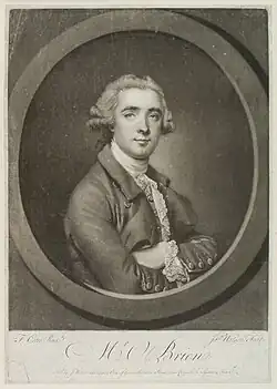 William O'Brien was probably born in County Clare in about 1740 to a family which claimed a distant connection to the Viscounts Clare. His father was a fencing master in Dublin.[1] David Garrick brought O'Brien over to London from Dublin in 1758 to join his actor's company at Drury Lane. O'Brien was successful in a number of roles, particularly Shakespeare and contemporary comedies.[2] He eloped with Lady Susannah "Susan" Fox-Strangways, eldest daughter of Stephen Fox, the first Earl of Ilchester, whom he had met when they both performed in amateur theatricals at Holland House.[3] Their marriage, which took place on 7 April 1764 at St. Paul's, Covent Garden, was disapproved of by Lady Susan's family.