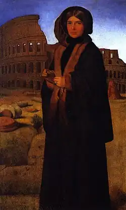 Page then went to Italy, where he resided for eleven years in Florence and Rome, coming back to New York in 1860. While he was in Italy, he painted the portraits of Robert and Elizabeth Browning and other well-known Englishmen and Americans. He also took occasion to study the works of the great masters, notably Titian, whom he admired and emulated, and whose method of painting he strove to discover. The copies that he executed of Titian's paintings were so remarkable that one of them was seized by the Florentine authorities under the belief that it was the original.[2] He was also a friend of William Wetmore Story and of James Russell Lowell, who dedicated his first collection of poems to him in 1843.