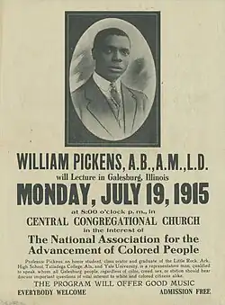 William Pickens (January 15, 1881 – April 6, 1954) was an American orator, educator, journalist, and essayist. He wrote multiple articles and speeches, and two autobiographies, The Heir of Slaves (1911) and Bursting Bonds (1923). In the latter book he noted race-motivated attacks on African Americans, both in the urban riots of 1919, which took place across the country, and in lynchings in 1921.[1]