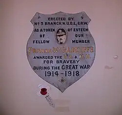 On 14 June 1917 at Messines, Belgium, after an enemy trench had been captured, Private Ratcliffe located an enemy machine-gun which was firing on his comrades from the rear, and single-handed, on his own initiative, immediately rushed the machine-gun position and bayoneted the crew. He then brought the gun back into action in the front line. Private Ratcliffe had displayed similar gallantry and resource on previous occasions.[4][5]