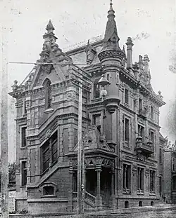 Sallie and Charles Forbes' house was commissioned in 1891 and completed in early 1892.[10] It was constructed on high ground with an unobstructed silhouette. The style was described as "Modern English Gothic", and the interior featured Spanish majogany and native cedar, while the foyer had a tile floor, mahogany double doors featuring art glass, and a "double-Newell mahogany staircase of unique design". The attic held a social hall, and an elevator ran from basement to attic.[11] The house sold to Henry W. Goode in 1897, who sold it to Laura and Graham Glass in 1902. The Glass family lived in the house until 1929.[10]