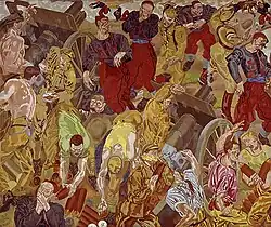 Roberts was intrigued by Post-Impressionism and Cubism, an interest fuelled by his friendships at the Slade (in particular with Bomberg) as well as by his travels in France and Italy after leaving the Slade in 1913. Later in 1913 he joined Roger Fry's Omega Workshops for three mornings a week. The ten shillings a time that Omega paid enabled him to create challenging Cubist-style paintings such as The Return of Ulysses[6] (now owned by the Castle Museum and Art Gallery in Nottingham). After leaving Omega he was taken up by Wyndham Lewis, who was forming a British alternative to Futurism. Ezra Pound had suggested the name Vorticism, and Roberts's work was featured in both editions of the Vorticist literary magazine BLAST. Roberts was a signatory to the Vorticist Manifesto that appeared in the first edition of the magazine. Roberts himself preferred the description "Cubist" for his work of this period.[7] Two large-scale oil paintings exhibited in the 1917 Penguin Club Vorticist exhibition in New York, and purchased by John Quinn, were subsequently lost,[8] but the radical nature of Roberts's "Cubist style" is evidenced by The Toe Dancer (owned by the Victoria and Albert Museum)[9] and the recently rediscovered Boxers[10] – both exhibited with the London Group in 1915.[11]