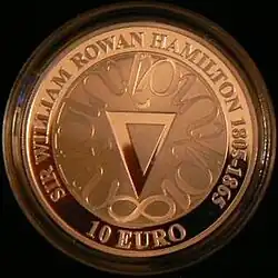 Two commemorative stamps valued ½ and 2½ pence were issued by the Irish postal service on 13 November 1943 to mark the centenary of the announcement of quaternions.[55][56] A 10-euro commemorative silver proof coin was issued by the Central Bank of Ireland in 2005 to commemorate 200 years since his birth.