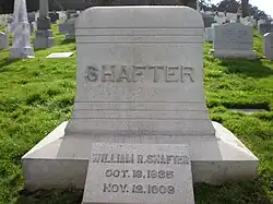 Shafter retired in 1901 to a 60 acres (24 ha) farm next to his daughter's land[1] in Bakersfield, California. He died there in 1906 and is buried at San Francisco National Cemetery.