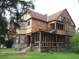 The William Russell House stands east of the downtown Pittsfield, in a builtup area on the north side of East Street between 2nd and 4th Streets. It is closely sandwiched by a tall government office building to its left, and the Providence Court housing complex to its right. It is a 2+1⁄2-story structure, with a cross-gabled roof configuration and an exterior finished in a variety of materials. Its foundation is rusticated granite, the first floor is finished in rusticated bluestone, and the second floor is finished in terra cotta tiled. The upper gable ends are finished in a combination of stucco and terra cotta tile. The porch extending along one side is decorated in marble and brownstone. The interior has very high quality woodwork and tile.[2]