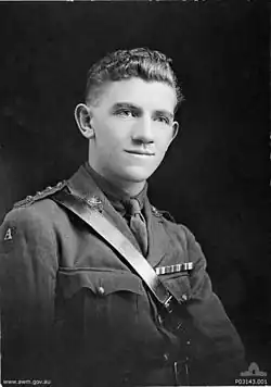 Shortly after arriving in France, he was placed in command of the 15th Light Trench Mortar Battery on specific request of his brigade commander, Harold Elliott, who had been his battalion commander at Gallipoli, and promoted to temporary captain.[3] For his leadership of this battery, he was later awarded the Military Cross.[11] In 1916, when in Petillon, France, he was badly wounded when inspecting a new kind of fuse on an unexploded bomb. He was evacuated to England and eventually lost the sight in one eye, and his right index finger. However, he continued to serve and became an instructor at I Anzac Corps School at Aveluy in June 1917. He later became the School's chief instructor, before returning to the front in 1918.[3]