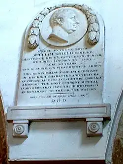 Shield is buried in the same grave as Johann Peter Salomon in the floor of the south cloisters of Westminster Abbey.[5][6] It seems no marker of any kind was put in place at the time to show where he lay. There was quite a search made near the centenary of his death and eventually a small marble tablet was put as near the grave as could be ascertained.