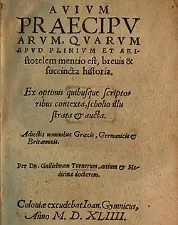 Quite early in his career, Turner became interested in natural history and set out to produce reliable lists of English plants and animals, which he published as Libellus de re herbaria in 1538. In 1544, Turner published Avium praecipuarum, quarum apud Plinium et Aristotelem mentio est, brevis et succincta historia ("The Principal Birds of Aristotle and Pliny..."), which not only discussed the principal birds and bird names mentioned by Aristotle and Pliny the Elder but also added accurate descriptions and life histories of birds from his own extensive ornithological knowledge. This is the first printed book devoted entirely to birds.[9]
