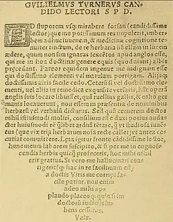 Turner was born in Morpeth, Northumberland, in or around 1508. His father was probably a tanner of the same name. He studied at Pembroke Hall, Cambridge University, from 1526 to 1533, where he received his B.A. in 1530 and his M.A. in 1533.[5] He was a Fellow and Senior Treasurer of Pembroke Hall, Cambridge. While at Cambridge he published several works, including Libellus de re herbaria, in 1538. He spent much of his leisure in the careful study of plants which he sought for in their native habitat, and described with an accuracy hitherto unknown in England.