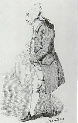 In the coming years Twaits made frequent appearances at the Park Theatre and the Olympic Theatre in New York during the winter seasons until his death in 1814. In July 1812 he became co-manager of the Olympic along with Alexander Placide and Jean Baptiste Casmiere Breschard.[12] Here Twaits decided to try his hand at tragedy, of which Dunlap wrote, 'Twaits seriously thought that his features were fitted for tragedy, and that he only wanted height to be like John Kemble'. He played Shylock in The Merchant of Venice; Lear in King Lear, and the title role in Richard III. However, his results were not a success with the Rambler for October 1806 which said of his Richard, 'Mr. Twait's peculiar physiognomy, his awkward gait, nasal twang, and petite form, all disqualify him from those parts where dignity of person, and gracefulness of carriage are essential concomitants.'[1] When the 5 feet 1 inch tall Twaits tried to play Prince Hall in Henry IV his performance was met with derision by the critics.[13][14][15]