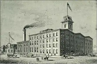 Construction was already underway by 1871, when an accident at the site killed one construction worker and injured two more.[12] The first buildings on the site, the brewery and a nearby residence, are thought to have been completed by either 1871[11] or 1872.[13] The brewery was fairly successful, and in 1875 the Brooklyn Daily Eagle described the Vigelius & Ulmer brewery as one of the larger breweries in the Williamsburg area, out of 30 or 40 breweries operating in the neighborhood.[14][13] Vigelius then relinquished his ownership stake in the brewery. Ulmer became its sole proprietor and subsequently reorganized it into the William Ulmer Brewery.[11] In 1881, some workers went on strike to protest low wages.[15]