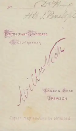 William was baptised in King's Stanley, Gloucestershire on 25 August 1833.[1] He was the son of a millwright. His first marriage was to Joyce Webb in 1858 and his initial career was as a teacher in Cainscross, Gloucestershire. Joyce bore William three sons before dying, and William remarried Mary Ann Aga in 1865. In 1868 he bought the photographic business of William Cobb of Ipswich and the family settled in London Road, Ipswich.[1] Cobb had been the photographic assistant to Richard Dykes Alexander, the prominent banker and pioneer photographer who had lived across the road from Cobb at Alexander House until his death in 1865.
