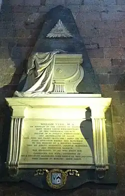 One of his sons, Richard, became a General.[7][8] Another, William, was Archdeacon of Coventry,[9] and it was he (according to the inscription) who had the monument to his father set up in Birmingham Cathedral. William had also daughters, one of whom, Mary (born 1745), married the Right Revd. Spencer Madan, Lord Bishop of Peterborough; and, dying in 1827, she was buried at Lichfield in the same vault as her brother General George Vyse.[10] Their sister Catherine in 1768 became the second wife of Sir George Smith, 1st Bart., was widowed in the following year, and died in 1786.[11]