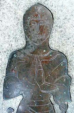His monumental brass and chest tomb in the Church of St Mary, Ilminster is said by William Henry Hamilton Rogers to depict him with his mother Joan Wrottesley, daughter of Sir William Wrottesley of Blore and Joan Bassett of Drayton Bassett, both in Staffordshire. It is among the best surviving brasses from the fifteenth century, and depicts him in complete plate armour exported to England by Milanese armorers; the finest of the period. His mother is wearing 'widow's weeds'.[4]