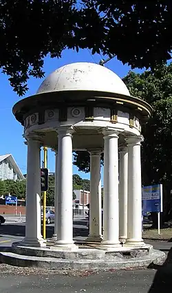 Wakefield arrived in New Zealand in 1839 as principal agent for the New Zealand Company.[1] He was regarded as Wellington's first leader,[2] and when he died in 1848, his friends raised the funds for a memorial, which was ordered from England; sources vary whether this was done in 1850,[2] in the early 1850s,[3] or in 1862.[4] The New Zealand Company's reputation deteriorated significantly, and the memorial was not installed, but put in storage in Bethune and Hunter's yard for many years.[2] William Barnard Rhodes, another prominent early Wellington settler, put up £50 towards the installation of the memorial in 1876.[2] In March 1882, Wellington City Council committee tasked the City Surveyor with finding a suitable site for the memorial, and the structure was temporarily put on public display in a council yard. Soon afterwards, the committee resolved to install the memorial at the Basin Reserve.[2][5] In 1886, a drinking fountain was added;[3] this had first been suggested by Rhodes.[2]