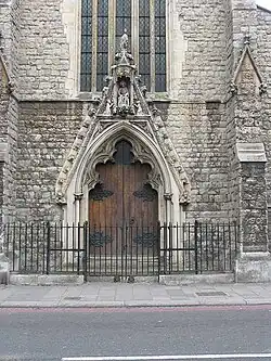He designed several London churches, many now listed by Historic England. Our Ladye Star of the Sea, Greenwich, begun in 1846 and completed c1851, is fronted by a tower completed by an ornate spire which in turn is complemented by the smaller spire of the adjacent stair turret.[7][8][9] The ruggedness of the rough faced stone tower with tall buttresses bears comparison with his later and much larger work, St. Patrick's Cathedral in Melbourne. Also heritage-listed is Our Immaculate Lady of Victories (also known as St. Mary's Church), situated in Clapham Park Road, Clapham, South London, constructed between 1848 and 1851,[10][11][12] the same year that Wardell completed Holy Trinity, Hammersmith. From 1853 to 1854, he designed St Mary's Church in Chislehurst, where Napoleon III was buried from 1873 to 1888.[13] Other Grade II* listed heritage buildings designed in part or full by Wardell include the Church of St Mary and St Michael in Stepney,[14] and the lower levels of the plain brick Church of St Peter and St Edward in Palace Street, Westminster.[15] At the former convent of the Holy Child Jesus on Magdalen Road in Hastings, Wardell designed the gateway, the training college a rugged Gothic style, and the priory in a polychrome brick mode, while his mentor Pugin designed the chapel.[16][17][18][19][20] Wardell also designed the Old Lodge and simple Chapel of the Sacred Heart of Digby Stuart College;[21] a lodge at Grove House in the London Borough of Wandsworth;[22] the plain brick industrial Spode Pottery including buildings around the north west courtyard, including the entrance gate and the bottle kiln at Stoke-on-Trent.[23] His last completed work in England was a fine chapel for family burials commissioned by Lord Petre, located in the forest at Thorndon Park, near Brentwood, Essex; this features an elaborately painted ceiling with hammerbeams featuring carved angels, and along with the ceiling and altar of the Sacred Heart Chapel in Digby is probably the only such decoration in his British work to survive.