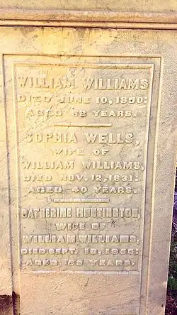 Williams married Sophia Wells, daughter of Samuel Wells, in 1811, in New Hartford. Their marriage brought fourteen children, several of whom died very young. Sophia died November 12, 1831.[7] Williams's son, Robert Stanton Williams, was born September 10, 1828, was the youngest surviving child of Sophia.[8] His second son, Samuel Wells Williams, named after Williams's father-in-law, was born September 22, 1812, who became a writer doing missionary work in China.[9] After the death of Sophia, Williams married again in 1833 to Catherine Huntington, the daughter of Hon. Henry Huntington of Rome, New York, a state legislator and the president of the Bank for Savings of the Village of Utica, the present day Bank of Utica.[10][11][c] Williams had fourteen children by his first wife, and two by his second. He lost several children when they were in their infancy or adolescent years; Fredrick in 1814, Laura, in 1820, Julian and Harriet, in 1824, Alfred and Thomas in 1831.[13]