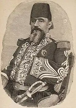 After the Confederate defeat in the Civil War, Loring served for nine years in the army of Isma'il Pasha, the Khedive of Egypt. He joined about fifty Union and Confederate veterans who had been recommended to the Khedive by William Tecumseh Sherman. Loring began as Inspector General of the army, a position in which he suggested various ways to modernize the army. He was then placed in charge of the country's coastal defenses, where he oversaw the erection of numerous fortifications. In 1875, he was promised the command of an Egyptian invasion of Abyssinia, however Ratib Pasha was given the assignment instead, and Loring was named chief of staff. Ratib Pasha was the ex-slave of the late Said Pawshar, the viceroy of Egypt, with negligible military qualifications; according to one of Loring's American compatriots, the freedman was "shrivelled with lechery as the mummy is with age."[5] The Egyptian-Ethiopian War ended in disaster at the Battle of Gura, and the Egyptians blamed the Americans for the disaster. When Ratib Pasha had urged remaining with the Gura fortress, Loring had taunted him and called him a coward until he consented to meeting the Ethiopian host in the open valley.[6] While the rest of the Egyptian army returned home, they were ordered to remain in Massawa until further notice, where they endured the summer months, then spent the next two years enduring endless frustration and humiliation in Cairo.[7] In 1878, partially due to finances, the American officers were dismissed. During his service to Egypt, Loring attained the rank of Fereek Pasha (Major General). After his return to the United States, he wrote a book about his Egyptian experiences, entitled A Confederate Soldier in Egypt (1884). Loring was also the posthumous co-author of The March of the Mounted Riflemen (1940).[8]