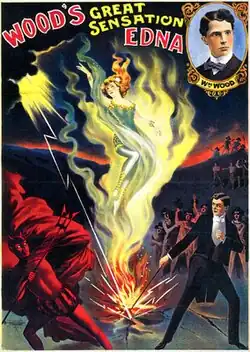 Wood was awarded patents, dated November 12, 1889,[8][9] for the equipment of a levitation illusion he called "Edna" in which a lady would be lifted up in mid-air and stay there, during which she walked, turned around, and turned over, all while in the air. Wood won a $3,200 verdict in December 1890 against another performer for infringing his patents.[10] After Wood's death, the magician Adelaide Herrmann used this illusion under the name of "The Maid of the Moon".[11]