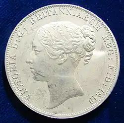 The name of William Wyon is well known among coin and medal collectors because of his prodigious output and artistic skill. He designed the second and third effigies of George IV, the effigy of William IV in 1830, working from the bust by Sir Francis Chantrey,[8] and "The Young Head", which graced Victoria's coinage from 1838 to 1860 on the pennies and the rest of the coinage until 1887.[9] He also designed the Naval General Service Medal, of which 20,933 were issued. Notable among his medallic work are the obverse designs for the prize, juror and other medals for The Great Exhibition at Crystal Palace in 1851, the year of his death in Birmingham.