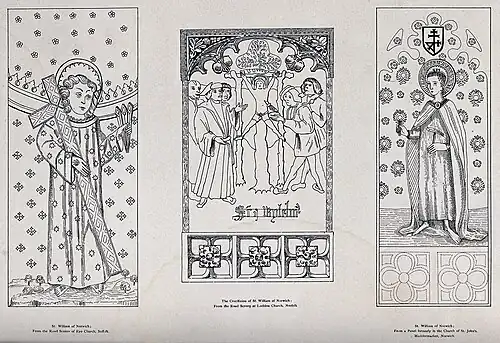 A boost to the shrine's popularity occurred after 1376, when William was adopted by the Norwich Peltier's Guild, whose annual service at Norwich Cathedral included a child playing the part of William.[22] There was a scholars' guild dedicated to St William in Bishop's Lynn (now King's Lynn).