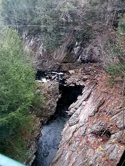 In Rockingham it is crossed by the Bartonsville Covered Bridge that was washed away in Hurricane Irene in August 2011, rebuilt in 2012, and reopened in January 2013,[7] as well as the Worrall Covered Bridge, the only 19th century covered bridge left in town. Below those bridges, it flows over Sokoki Falls, named for the local band of the Abenaki,[8] and through Brockways Mills Gorge.