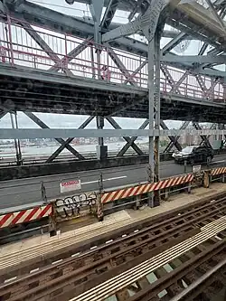 By 1946, the city government planned to spend $127,000 on structural repairs to the bridge.[311] The southern outer roadway was closed for repairs starting in April 1947,[312] and rollers under the bridge's suspension towers were replaced the same year.[313] The south outer roadway was completed in November 1947,[314] and the north outer roadway was closed in February 1948.[315] Meanwhile, the New York City Board of Estimate allocated $2.6 million in the city's 1948 capital budget to replace the bridge's south-side streetcar tracks with a roadway.[316] All streetcar service ceased in December 1948,[317] and construction on the south inner roadway began immediately after streetcar service ended.[318] The new roadway opened October 31, 1949.[319] In conjunction with these projects, Delancey Street in Manhattan was widened to reduce congestion at the bridge's entrance.[320]