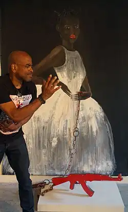 In June 2016, Little returned to the McColl Center for Art + Innovation in Charlotte, N.C., for an exhibit titled "prompt" created by three alumni artists-in-residence. Little was a resident artist at McColl in 1999. The alumni were given four weeks to create individual installations based on three prompts: the words "divisions and differences" must be a catalyst, the artists must use a material, process or approach new to him or her, and it must have an interactive element with viewers.[16] Little's mixed media installation "American Obsession" examines gun violence, race, and standards of beauty, according to a statement by the artist which accompanied the work. "Lips and backsides, dating back to the Hottentot Venus in the 1800s, once ridiculed and mocked, are now a premium to achieve, speaking to the influence of Black Culture on the world," Little wrote. "Chains, like the one attached to the figure you see here, symbolize enslavement and restriction. Sometimes being constricted can force creative resilience." Gallery guests were invited to engage with the installation by repositioning a toy AK-47 to suggest whether the beautiful woman in the painting is a victim, victor or neither. He tapped into an American obsession with selfies by encouraging viewers to take selfies with the installation and post them at #AmericanObsession.