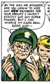 In his first comic book appearance, Lumpkin is represented as having befriended the Fantastic Four, to whom he makes regular fan mail deliveries at their Baxter Building headquarters in New York City. He half-jokingly requests to join the team on the grounds that he has the "power" to wiggle his ears.