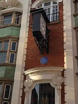 A London County Council blue plaque unveiled in 1966 commemorates Clarkson at his former shop in Wardour street.[34][35] The building retains a clock above the entrance, advertising it as the business premises of a Costumer and Perruquier.[Note 6] In 1974, the building was Grade II Listed.[36] Since the 1980s,[37] it has been occupied by the well-known Wong Kei Chinese restaurant.