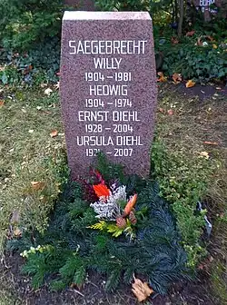 There is no indication that Sägebrecht's own loyalty to the regime was ever in question: he remained a Party Central Committee member till 1963.[1] However, after September 1959 he lived as a pensioner in East Berlin. In 1968 he published his memoires under the title "Nicht Amboß, sondern Hammer sein" (loosely "Not an anvil but a hammer").[12] When he died, in 1981, his ashes were placed at the Friedrichsfelde Cemetery in the Gedenkstätte der Sozialisten ("Socialists' Memorial Garden"), alongside those of others whose memories the government celebrated and revered.[13]