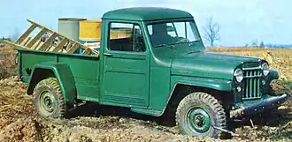 The Jeep Truck was introduced in 1947 as a 1-ton four-wheel drive truck with a wheelbase of 118 inches (2,997 mm). It was available as a pickup truck, a platform stake truck, a chassis cab, or a bare chassis. A ¾-ton two-wheel drive version became available by 1949.[1]