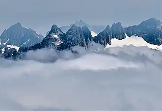 Wilmans Peaks is located in the marine west coast climate zone of western North America.[2] Most weather fronts originate in the Pacific Ocean, and travel northeast toward the Cascade Mountains. As fronts approach the North Cascades, they are forced upward by the peaks of the Cascade Range (Orographic lift), causing them to drop their moisture in the form of rain or snowfall onto the Cascades. As a result, the west side of the North Cascades experiences high precipitation, especially during the winter months in the form of snowfall, and because of maritime influence, snow tends to be wet and heavy, resulting in high avalanche danger.[2] During winter months, weather is usually cloudy, but, due to high pressure systems over the Pacific Ocean that intensify during summer months, there is often little or no cloud cover during the summer.[2] Due to its temperate climate and proximity to the Pacific Ocean, areas west of the Cascade Crest very rarely experience temperatures below 0 °F (−18 °C) or above 80 °F (27 °C).[2] The months July through September offer favorable weather for viewing or climbing the peaks.