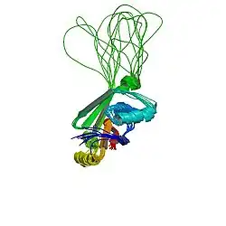 The gene is a member of the P-type cation transport ATPase family and encodes a protein with several membrane-spanning domains, an ATPase consensus sequence, a hinge domain, a phosphorylation site, and at least two putative copper-binding sites. This protein functions as a monomer, exporting copper out of the cells, such as the efflux of hepatic copper into the bile. Alternate transcriptional splice variants, encoding different isoforms with distinct cellular localizations, have been characterized.[6] Wilson's disease is caused by various mutations. One of the common mutations is single base pair mutation, H1069Q.[5]