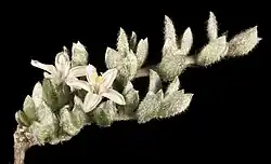 Silky wilsonia is a low-growing mat forming species, growing to 10 cm tall. The plant is covered with short, white hairs imparting a silvery appearance. The small, crowded leaves are concave and overlapping and are 1.5 to 4 mm long and 2 to 3 mm long.[3] White flowers appear between September and December in the species' native range.[4] These are followed by capsular fruits which are 3 mm long.[3]
