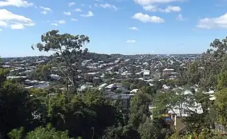 Wilston is located 5.1 kilometres (3.2 mi) by road north of the Brisbane CBD.[4] It has a mixture of old and new styles of architecture, from workers' cottages to modern architect-designed homes on Wilston Hill.