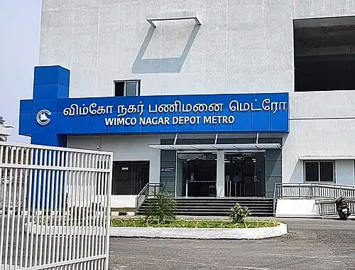 Wimco Nagar Depot Metro station is a Metro railway station on Line 1 Extension of the Chennai Metro. The station is one of the 10 stations in the Phase I northern extension and one of the 26 stations along the Blue Line (Chennai Metro) of the Chennai Metro. The station will serve the neighbourhoods of Ernavur and other northern suburbs of Chennai. This station was inaugurated along with Thiruvottriyur Theradi Metro Station on 14 March 2022.[1]