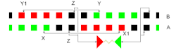 Any small charge on either of the two discs suffices to begin the charging process. Suppose, therefore, that some of the sectors on the front disc ([A] lower chain) are positively charged (red) and that the front disc rotates counter-clockwise (right to left). As the charged sector (moving red square) rotates to the position of the brush on the rear neutralizer bar ([Y] down arrow tip) it induces a polarization of charge on the neutralizer bar ([Y-Y1] upper horizontal black line) attracting negative (green) charge to the sector immediately opposite it ([Y] upper square becoming green) and positive (red) charge on the sector across the disc 180 degrees away ([Y1] upper square becoming red). When this latter positive charge reaches the place where the front neutralizer bar is ([X]) it induces a negative charge on the sector on the front disc ([X] lower square becoming green) and simultaneously a positive (red) charge on the sector on the opposite side of the disc ([X1] becoming red). The positive charges are collected from both sides of the discs at [Z] and [Z] and the negative charges are collected on the other side of the discs (not labelled on the diagram).