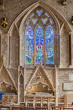 The stained glass windows by Douglas Strachan were installed as a memorial to the men of the town who gave their lives in the First World War, and in thanksgiving for those who returned safely home. The windows in the south aisle on the themes of Land, Air and Fire, and Sea are some of the finest stained glass of the twentieth century in Britain.[13] They were presented to the church by Robert Younger, Baron Blanesburgh and dedicated in 1933 by the Archbishop of Canterbury. The altar and retable in the Lady Chapel were also presented by Lord Blanesborough as was the organ above the west porch.
