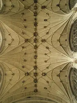 During the end of 2012, a high-level internal access scaffold was erected in the presbytery to enable close inspection of the vault and clerestory windows. The vault was subject to a detailed construction and paint analyses. The results of the inspection and analysis revealed severe corrosion in the windows, many of which had holes in and collapsed glass, and the failure of the lead roof above, which was causing degrading to the 16th-century wooden vault of the presbytery. A trial removal of the 1950s paint revealed the surviving 16th-century paint underneath on the nearly 200 roof bosses.[24] In July 2013, a £10.5 million grant from the Heritage Lottery Fund allowed the restoration work to begin.[25]