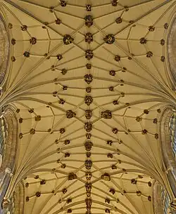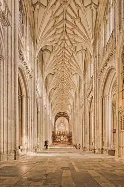 The nave, originally built between c.1100 and c.1129, was remodelled into the Perpendicular Gothic style from 1346 to 1420, keeping much of the original Norman work by encasing it in new stone, and remastering the elevations, merging the previous three-tier structure as in the transepts into two. It is amongst the widest Gothic naves in the country and the longest nave of its kind in Europe. The nave has a spectacular stone vault, complete with hundreds of bosses. The nave aisles are also vaulted in stone and are rather narrow by comparison to the central nave, which gives both an impression of width and height. The nave, including the aisles, is 82 feet (25 metres) wide.[4][6][7][45]
