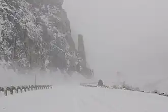 Work on U.S. 20/Wyo 789 through Wind River canyon began in 1922 and was finished in 1924, replacing the Bird's Eye Pass Route over the Owl Creek Mountains.[3] U.S. 20/Wyo 789 travels through the canyon, at times level with the canyon floor. The scenic route offers views of the canyon and landmark natural structures like the Chimney Rock. The canyon is at times as much as 2,500 feet (760 m) feet deep. The change in elevation between the Bighorn Basin and the Wind River Basin is about 300 feet (91 m).[4]