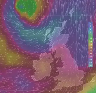 It is generally reported in METAR when the peak wind speed reaches at least 16 knots (30 km/h; 18 mph) and the variation in wind speed between the peaks and average wind is at least 9 to 10 knots (17 to 19 km/h; 10 to 12 mph).[1][4] In marine meteorology, the top speed of a burst is expressed in meters per second (m/s) or in knots, while the Beaufort scale is used for reporting the mean speed. When the maximum speed exceeds the average speed by 10 to 15 knots (19 to 28 km/h; 12 to 17 mph), the term gusts is used while strong gusts is used for departure of 15 to 25 knots (28 to 46 km/h; 17 to 29 mph), and violent gusts when it exceeds 25 knots (46 km/h; 29 mph).[4]