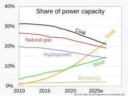 Wind energy penetration is the fraction of energy produced by wind compared with the total generation. Wind power's share of worldwide electricity usage in 2021 was almost 7%,[54] up from 3.5% in 2015.[55][56]